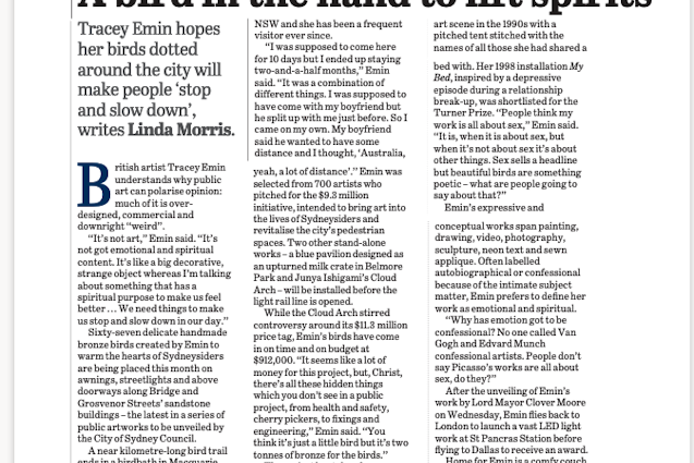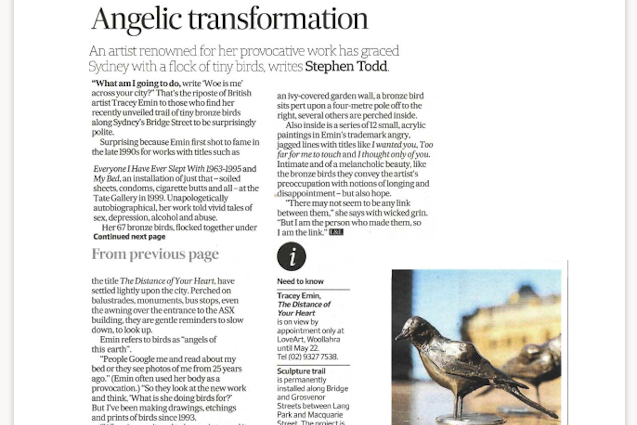 Her 67 bronze birds ... are gentle reminders to slow down, to look up. AFR (3 April 2018)